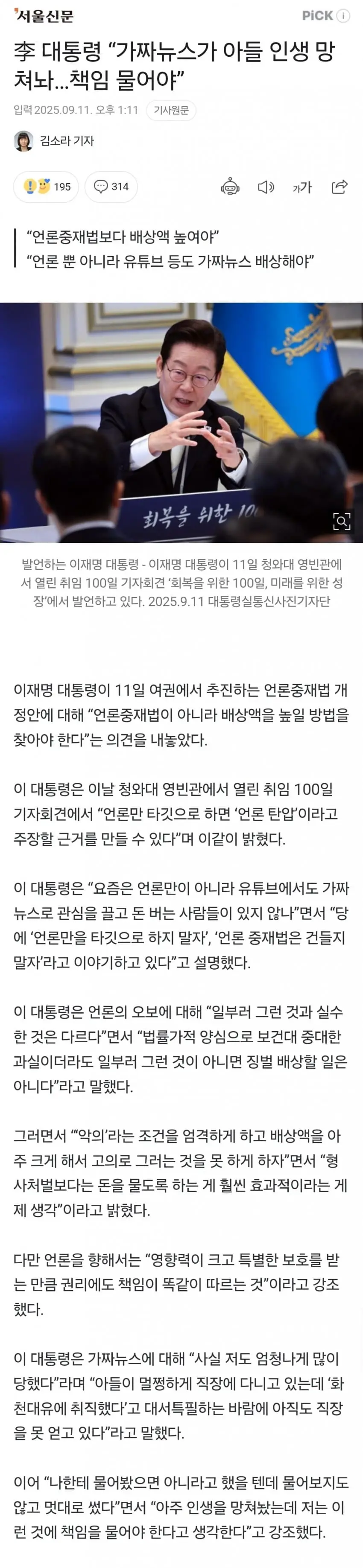 李 대통령 “가짜뉴스가 아들 인생 망쳐놔…책임 물어야”