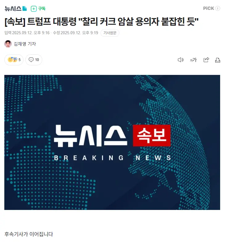 [속보] 트럼프 대통령 "찰리 커크 암살 용의자 붙잡힌 듯"