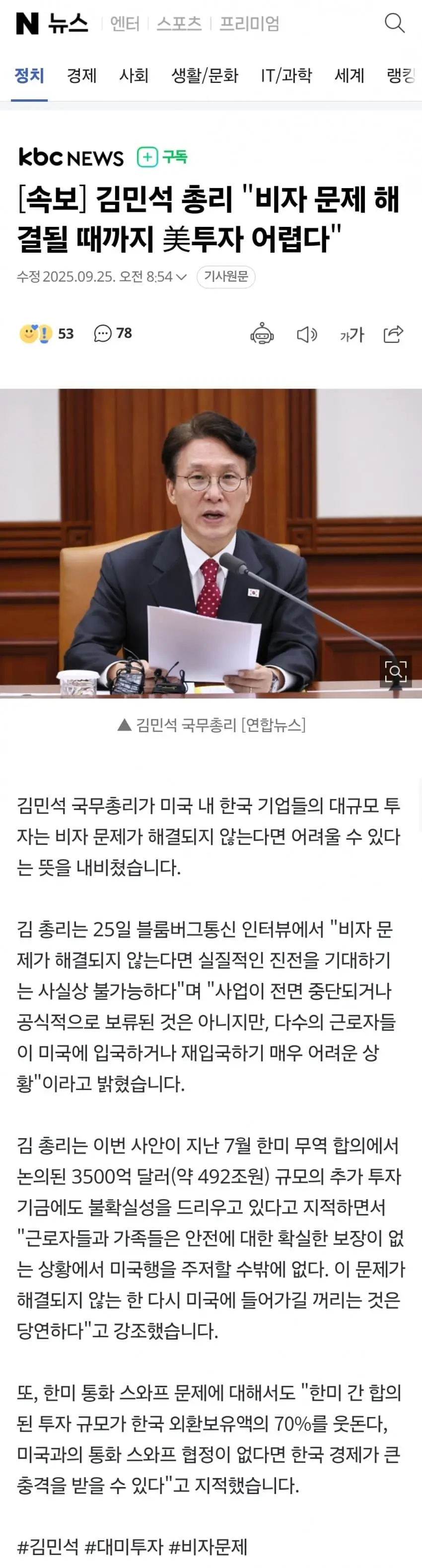 김민석 총리 "비자 문제 해결될 때까지 美 투자 없다"