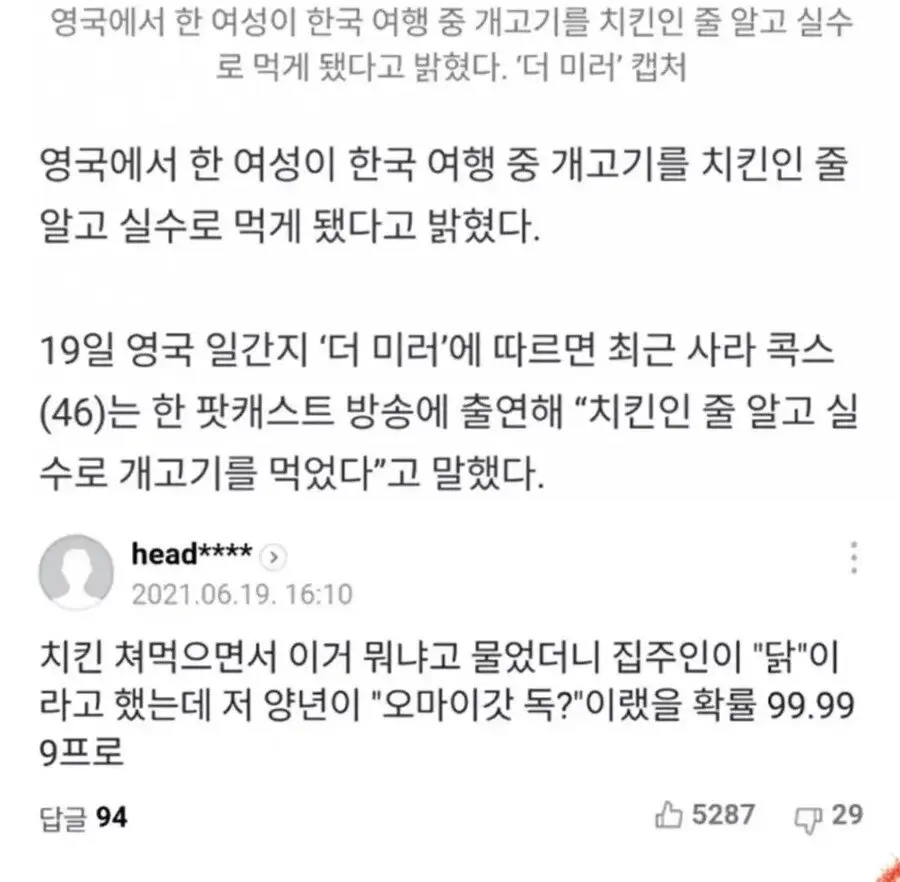 한국에서 실수로 개고기를 먹었다는 영국 여자
