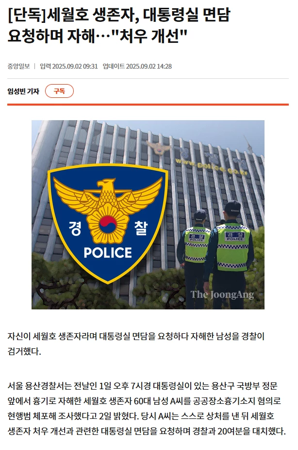 세월호 생존자, 대통령실 면담 요청하며 자해…"처우 개선"