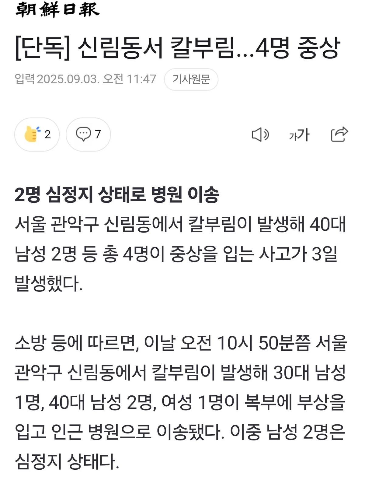 [단독] 신림에서 칼부림...4명 중상 2명심정지