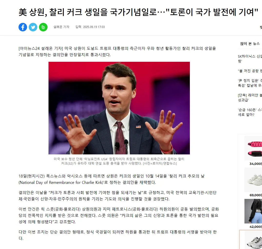 美 상원, 찰리 커크 생일을 국가기념일로⋯"토론이 국가 발전에 기여"