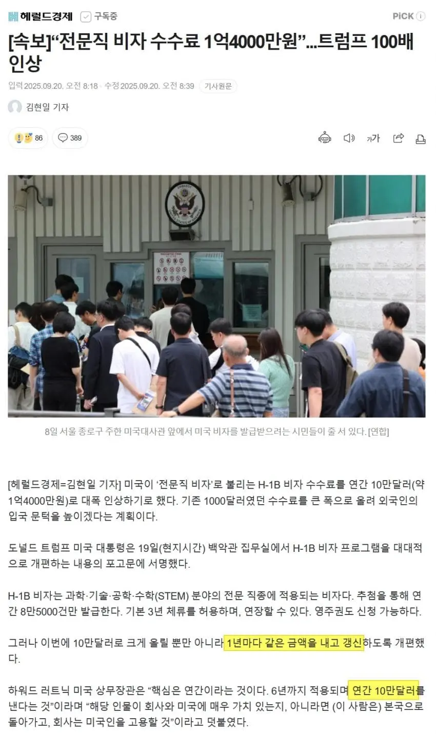 트럼프, H-1B 비자 수수료 100배 인상 서명