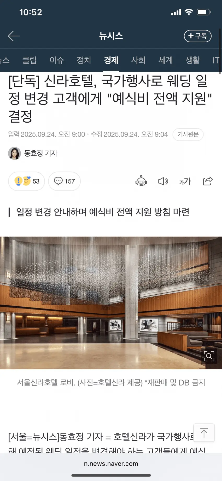 신라호텔, 국가행사로 웨딩 일정 변경 고객에게 "예식비 전액 지원