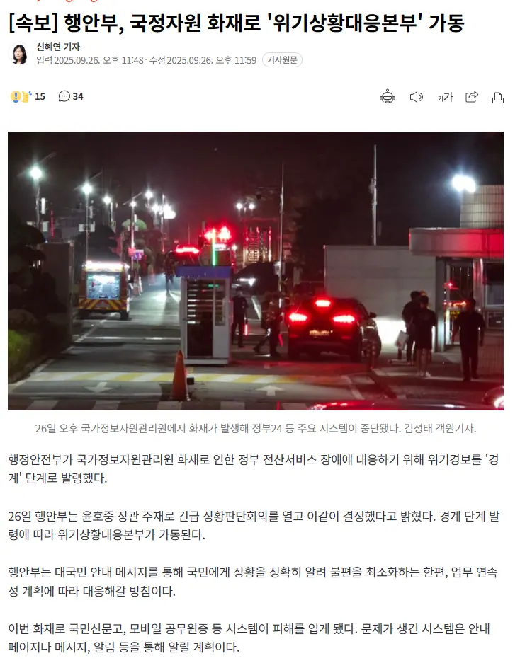 [속보] 행안부, 국정자원 화재로 '위기상황대응본부' 가동