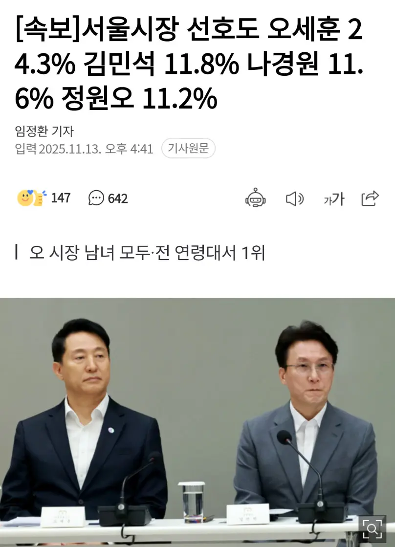 내년 지방선거 서울시장 선호도 오세훈 압도적 1위